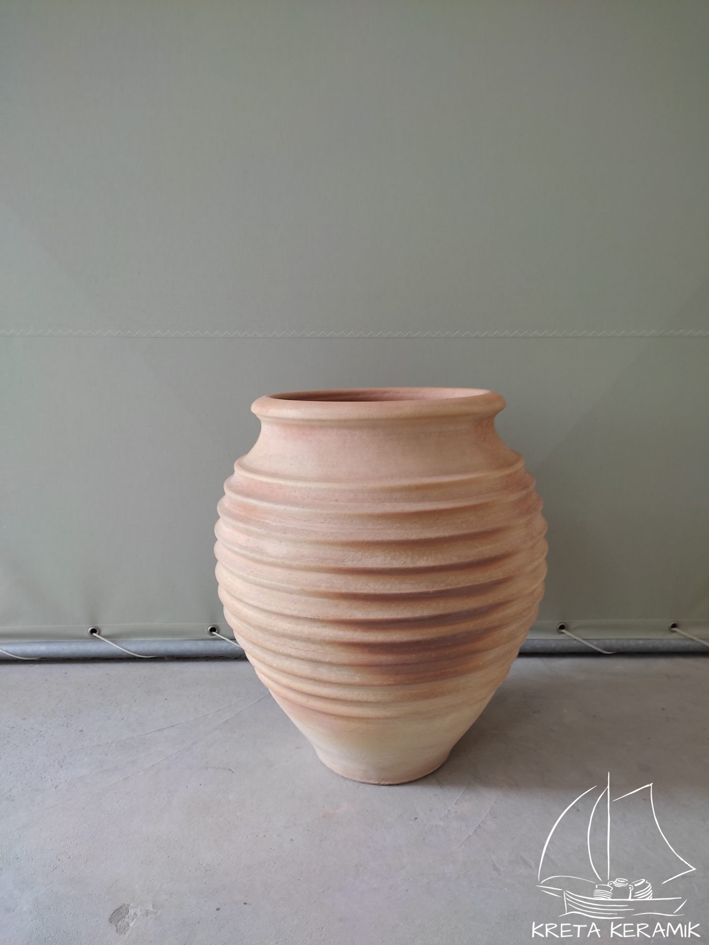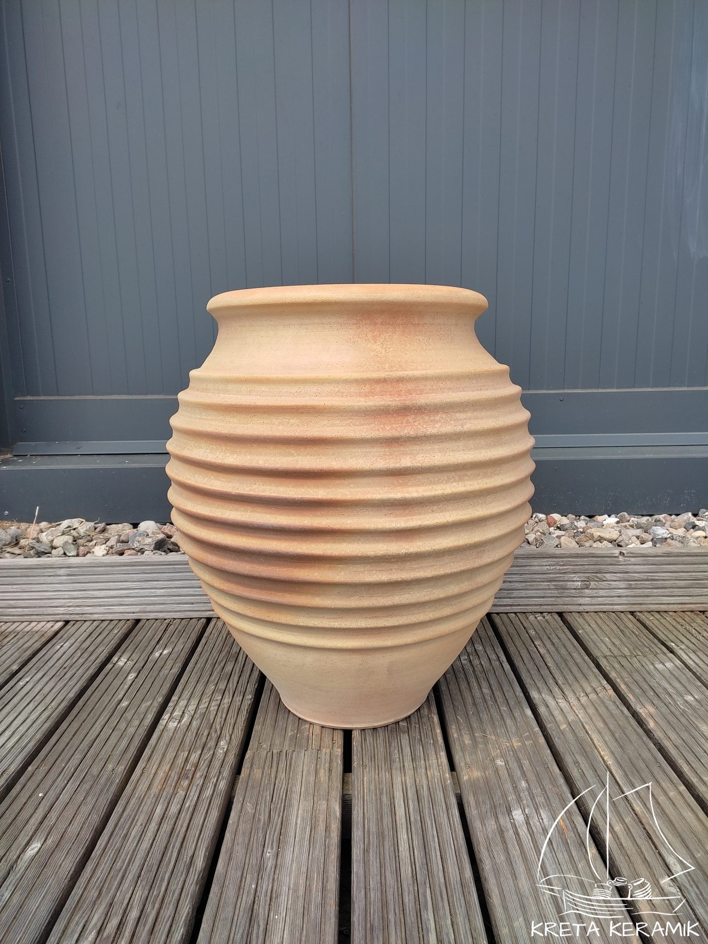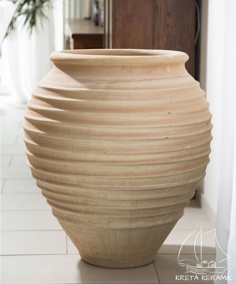 Traditioneller rundbauchiger Amphorentyp.  „Ficus“, Größe H=60 cm hat mind.10 umlaufende, ausgeprägt ausgearbeitete Ringwulstverzierungen und eine Drainageöffnung im Boden. Frostbeständig. Töpferarbeit. Im Holzofen gebrannt.